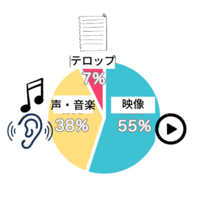 視覚(映像)、聴覚(声・音楽)、言語(テロップ)